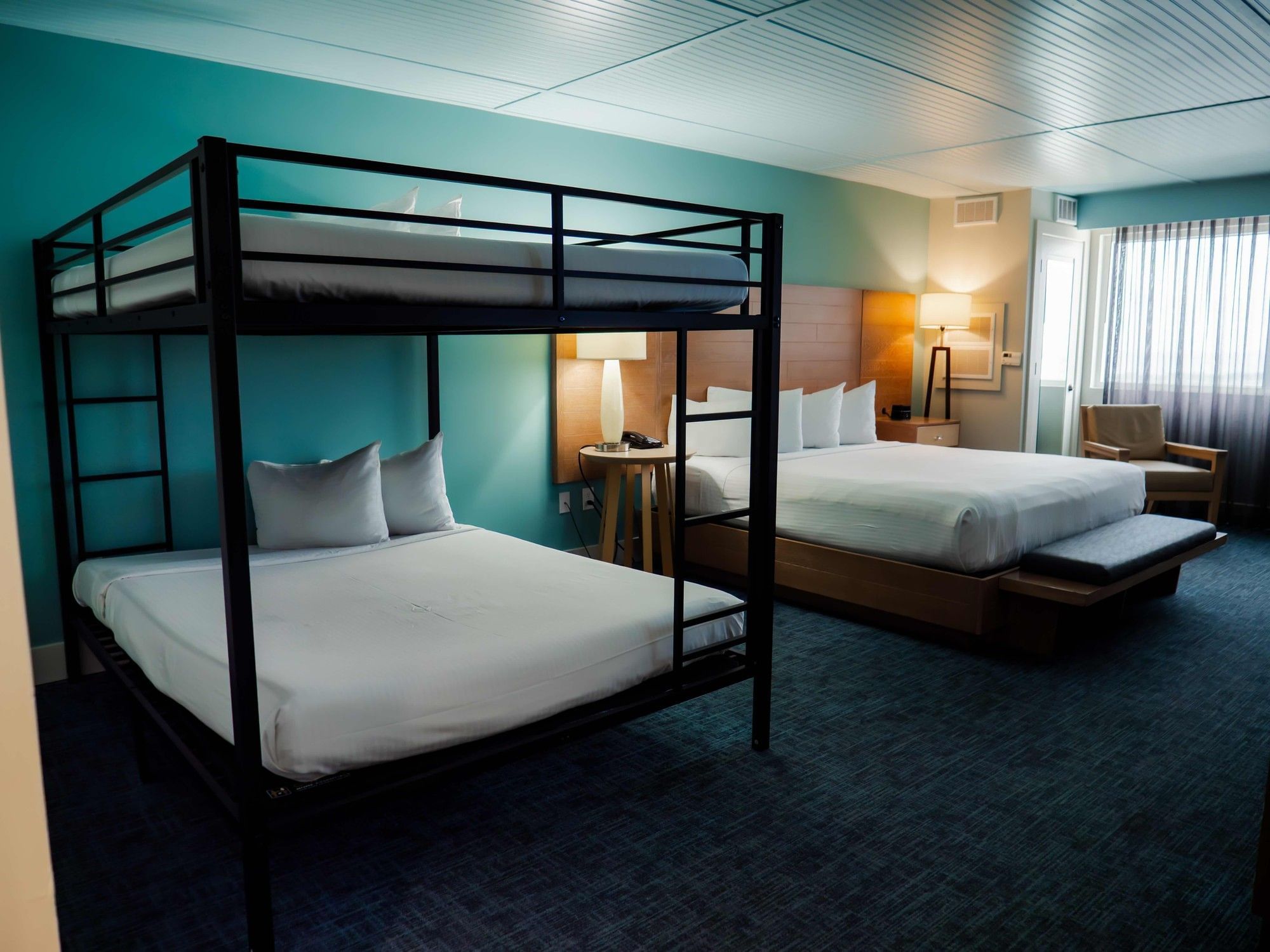 Designed with families in mind, this spacious suite features a king bed, a bunk bed (two additional beds), and stylish beach-inspired décor.