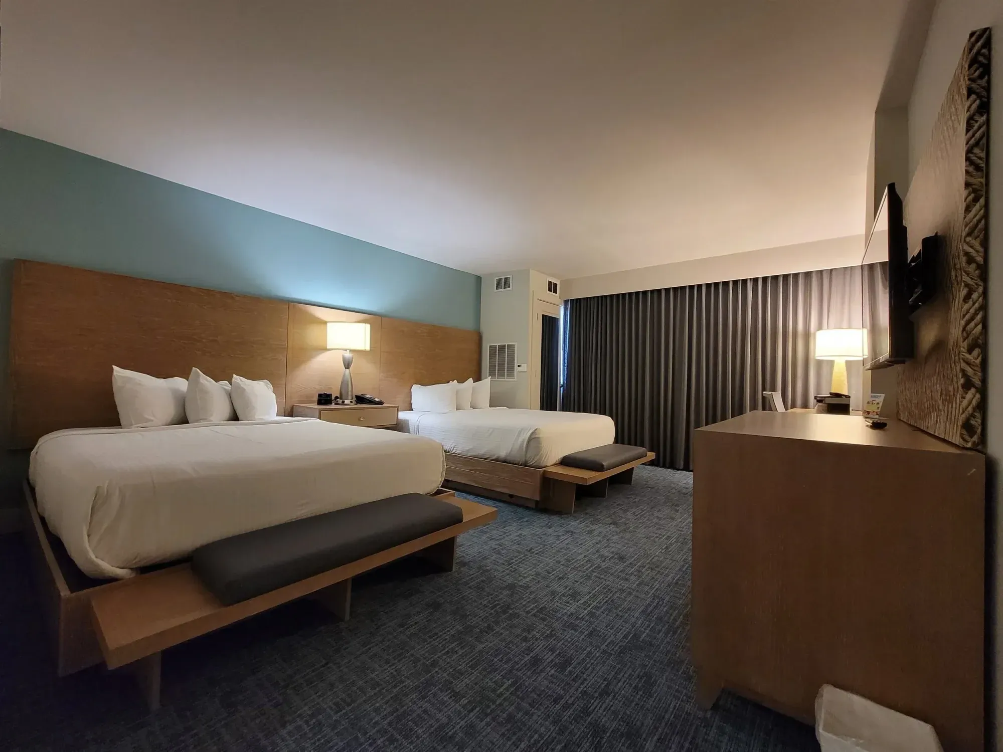 Relax in a spacious retreat designed for comfort and style, featuring two queen beds with luxe white linens.
